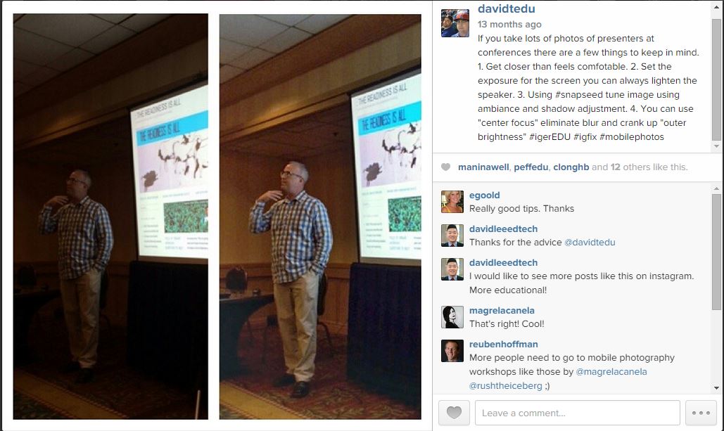 Tool Talk: Taking Pictures of Presenters January 4, 2015 • David Theriault I can’t tell you how many times I see a picture of a presenter where either I can’t see the picture from the presentation, or I can’t see the presenter. Here’s how to fix that problem. PS I love the app Snapseed. Share this: Click to share on X (Opens in new window) X Click to share on Facebook (Opens in new window) Facebook Click to share on LinkedIn (Opens in new window) LinkedIn Click to share on Reddit (Opens in new window) Reddit Click to share on Pinterest (Opens in new window) Pinterest Click to email a link to a friend (Opens in new window) Email Like Loading... Related