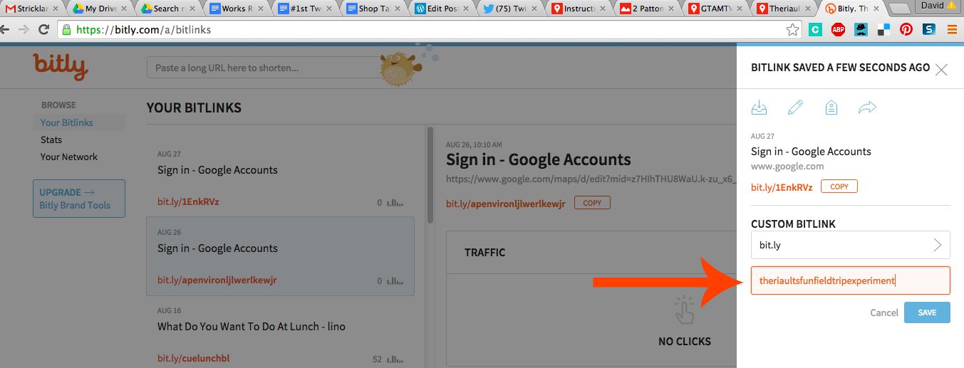 Once you are completely done with your map. Grab the url of the completed map. Then go to bit.ly.com and make sure you sign up for an account or sign into your account. Then drop your long Google url into the bit.ly converter and transform it into a custom shareable link. Write this link on your whiteboard or on a handout and your students can easily type in the bit.ly and then your custom Field Trip map will open on their smart phone.