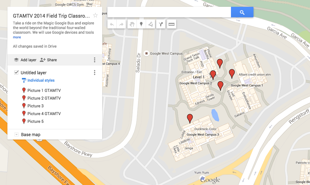 We created a Google Map with “pins” to locations around the quad in the Google Complex in Mountain View. Every student got a bit.ly, QR code, or NFC tag that opened a Google Map. It looked like this: